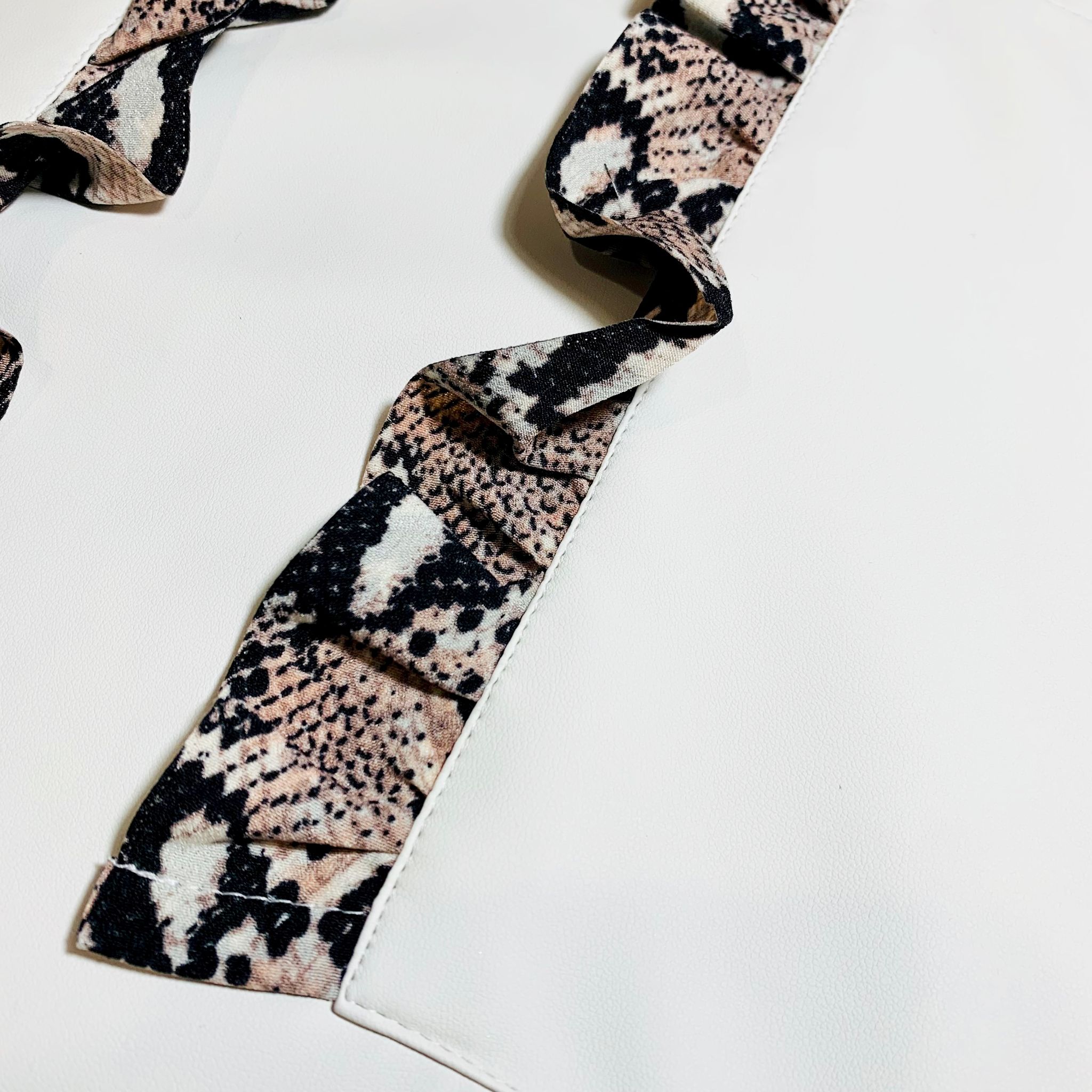 - ozdobne duże kieszonki ozdobioe są urokliwymi falbankami w print wężowy, które nadają charakteru fartuszkowi