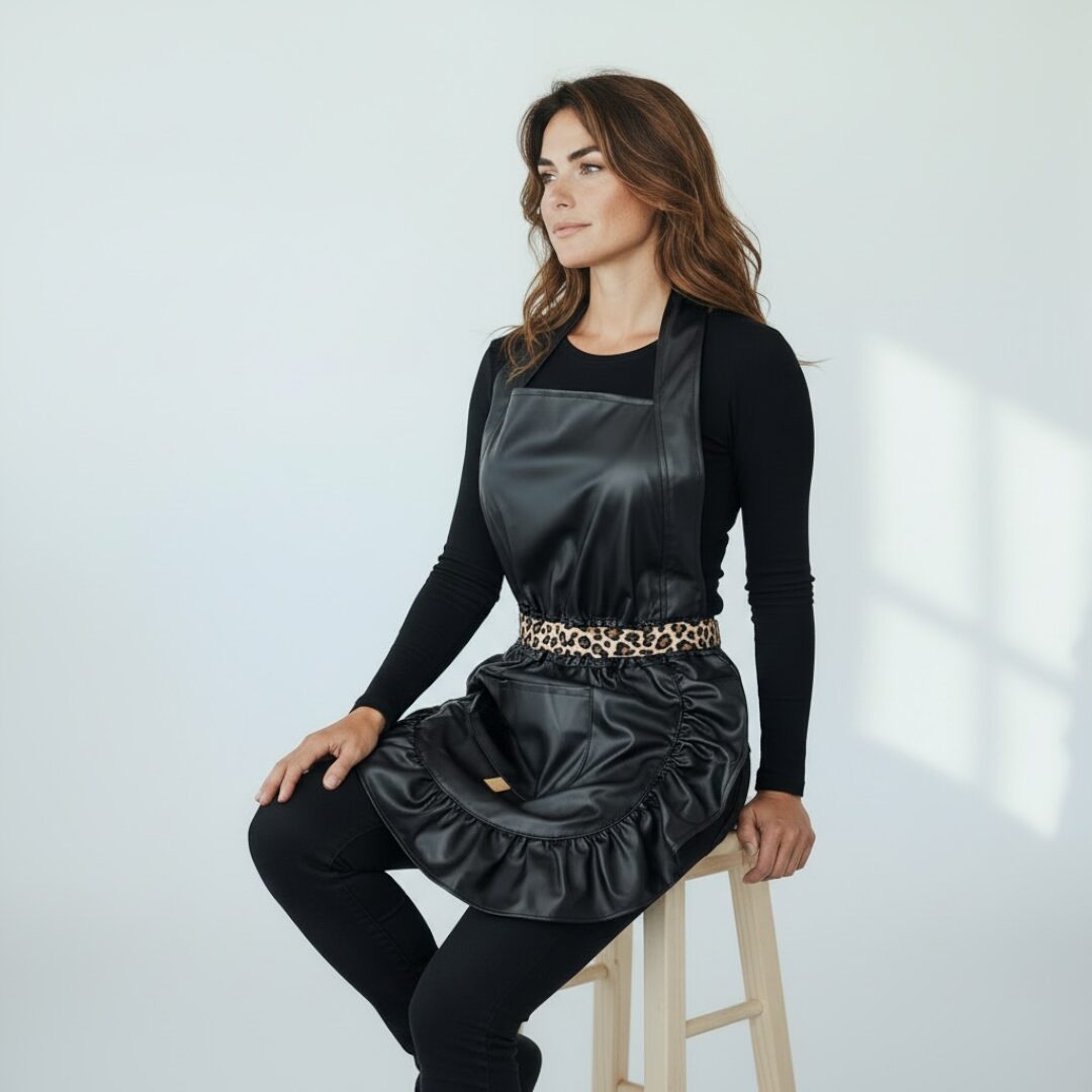 Stylowy pas w modnym wzorze panterki dodaje charakteru i sprawia, że fartuszek jest nie tylko funkcjonalny, ale także modny.