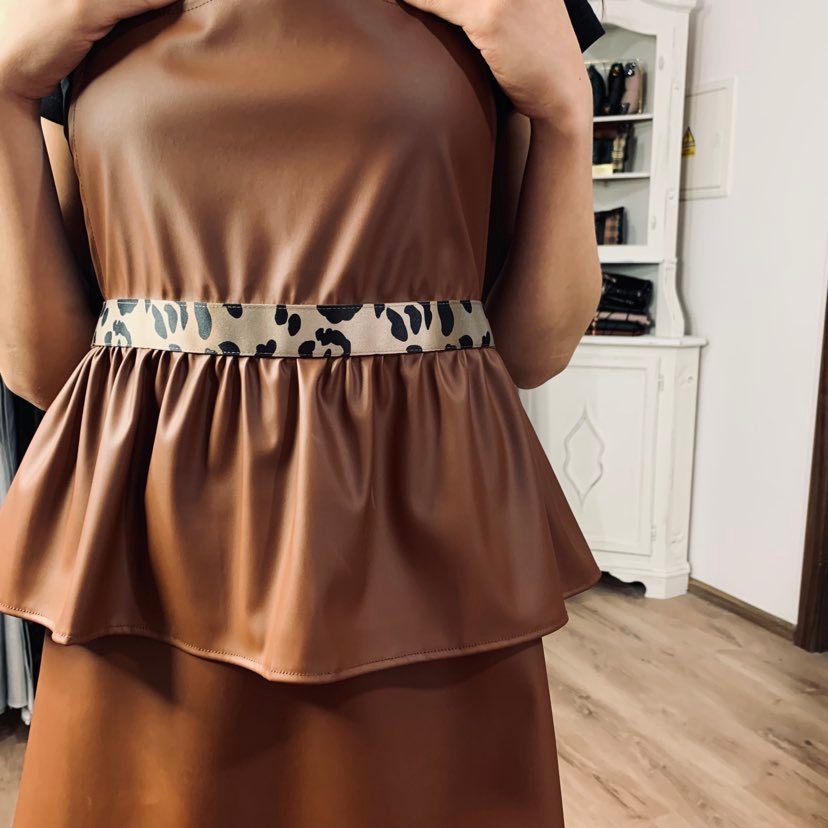 Ma dodającą uroku, kobiecości –  baskinkę i charakterny panterkowy paseczek.