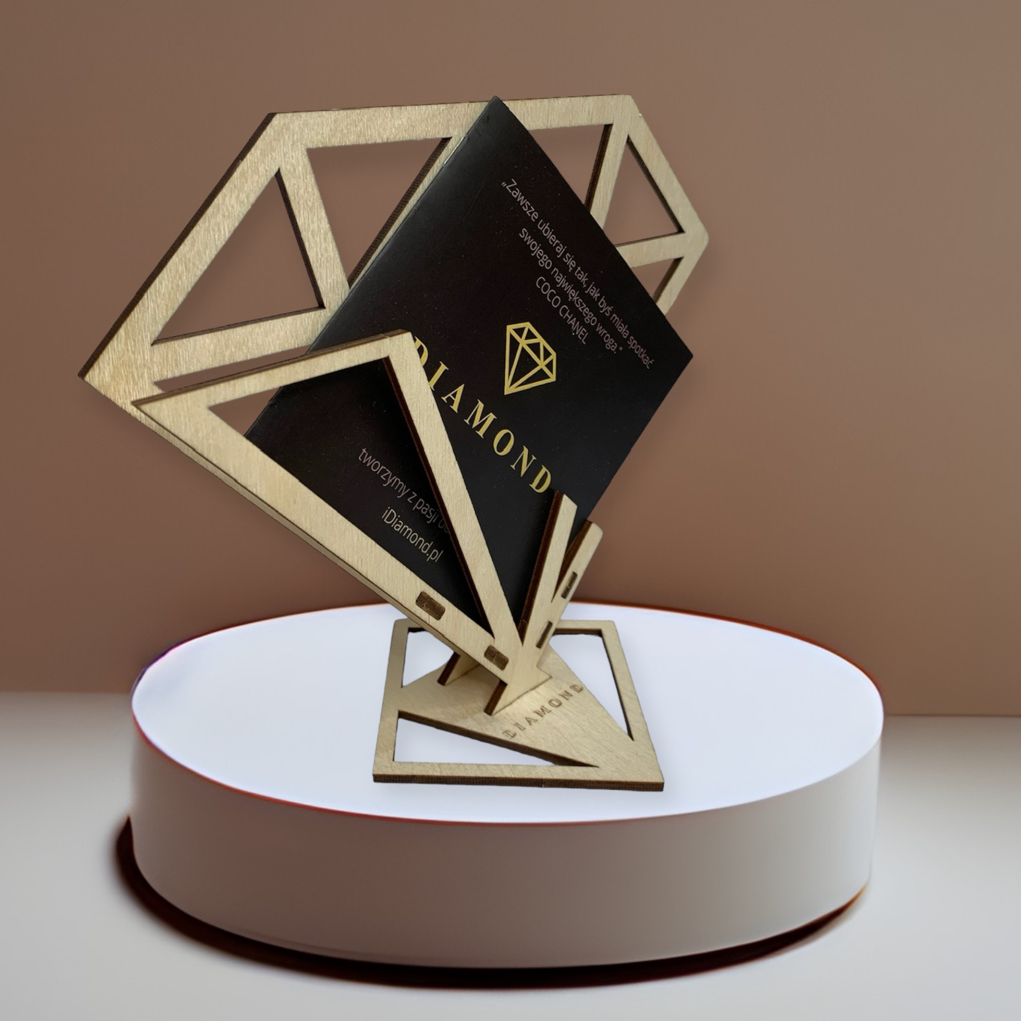 Drewniany stojak na ulotki, elegancki i w kształcie ażurowego diamentu, to doskonałe rozwiązanie do organizacji materiałów promocyjnych lub informacyjnych w Twoim biurze czy punkcie sprzedaży.
